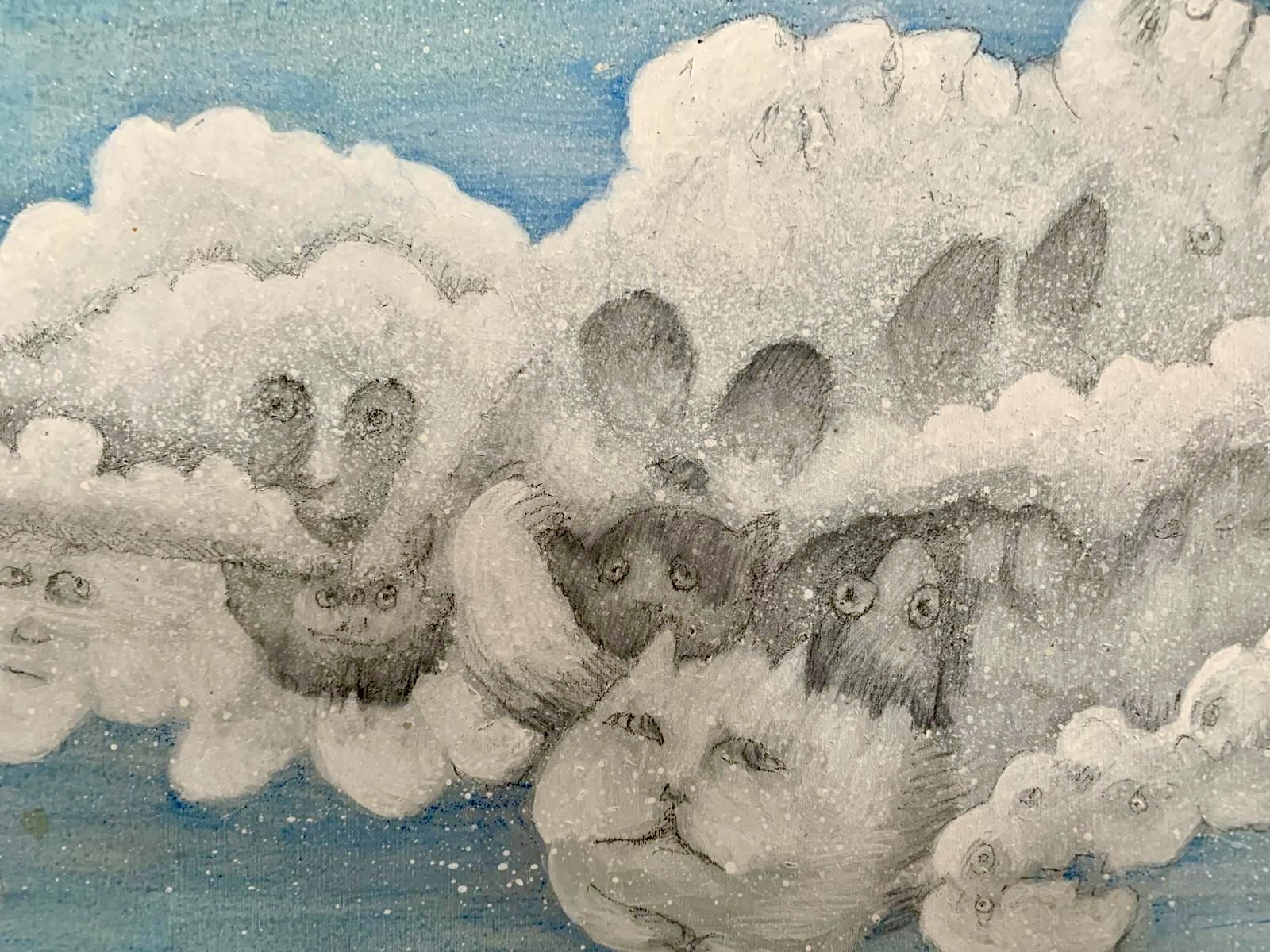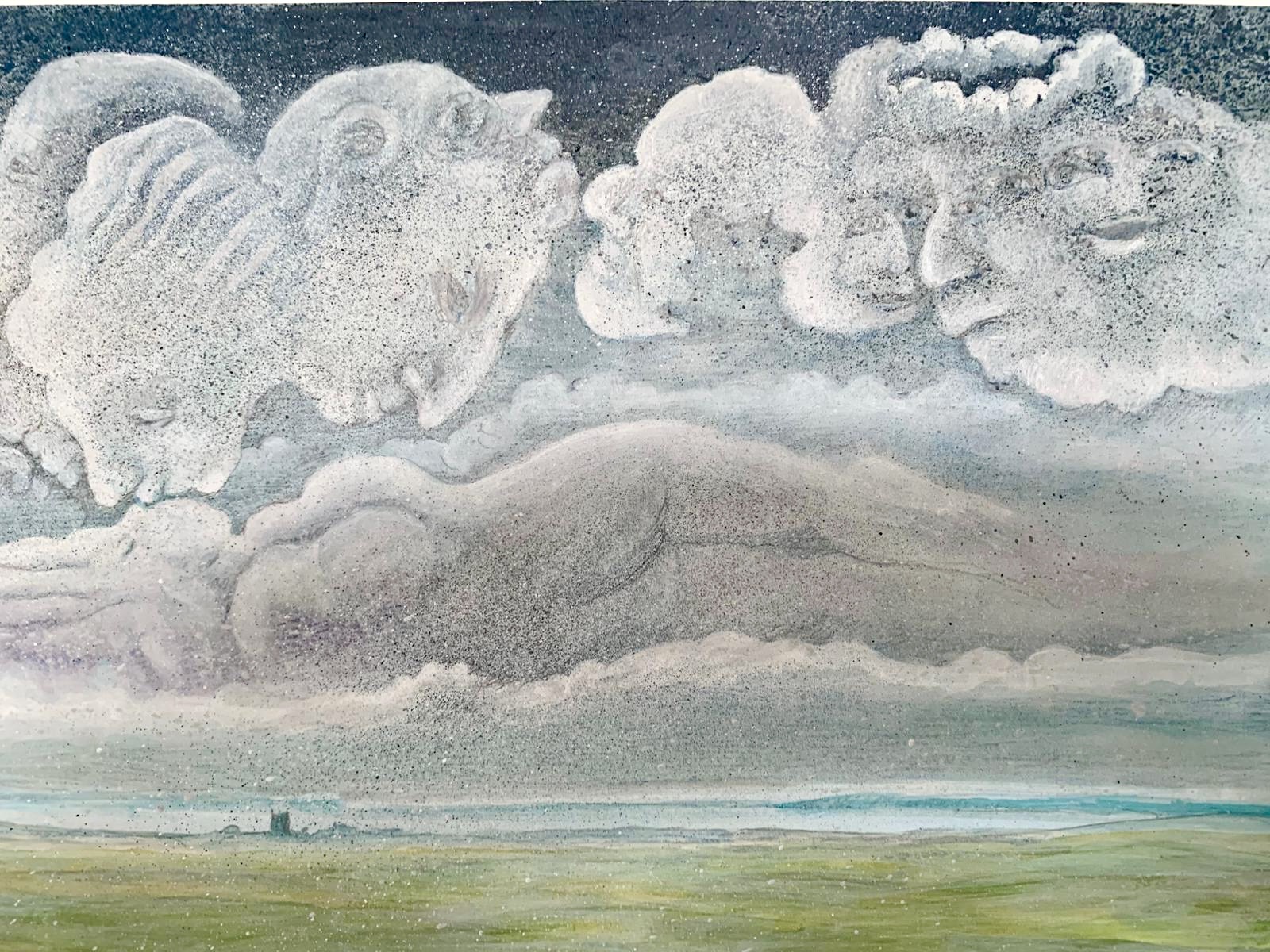 As a short-sighted child, the artist experienced the sky as blurred and indistinct. Art books filled with dramatic skies and figures emerging from vapour — from painters such as Michelangelo and Rubens — fuelled her imagination. Clouds became populated with imagined forms, monsters, and figures that hovered between vision and hallucination. Although corrective lenses eventually sharpened her sight, the habit of imagining never left.