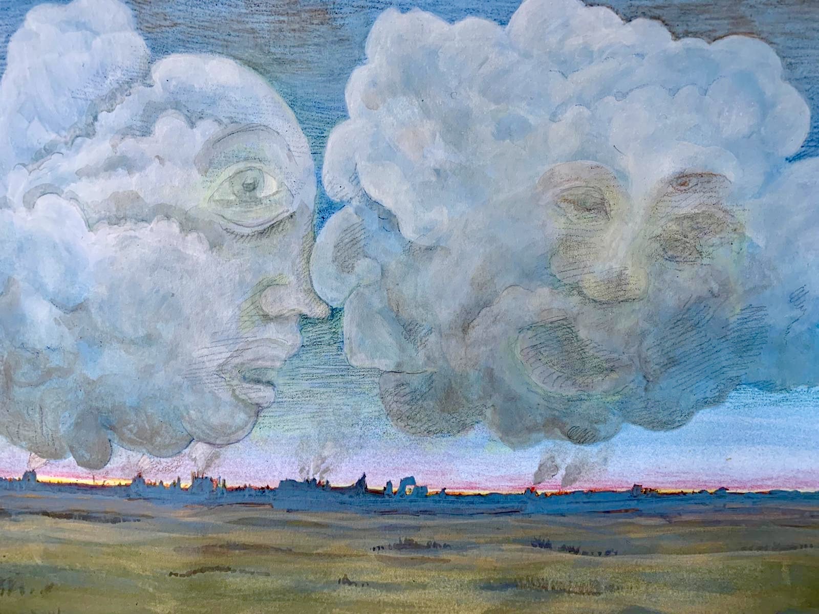 In this recent body of work, cloud formations function as emotional and psychological landscapes. Figures emerge and dissolve within them, suspended between presence and absence. In a contemporary context marked by ecological instability and political unease, these paintings reflect a growing disconnect from the natural world, even as the sky itself becomes increasingly charged. The clouds depicted here act as registers of collective mood, suggesting both looming threat and fragile optimism — an atmosphere of uncertainty that nonetheless leaves room for transformation.